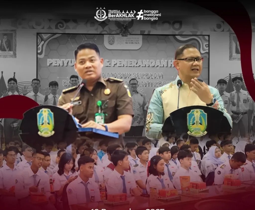 Surabaya – Kejaksaan Tinggi Jawa Timur melalui Seksi Penerangan Hukum menggelar penerangan dan penyuluhan hukum “Jaksa Masuk Sekolah” dalam rangka Peringatan Hari Antikorupsi Sedunia (Hakordia) Tahun 2025 di Aula Dinas Pendidikan Provinsi Jawa Timur, Selasa (16/12/2025).