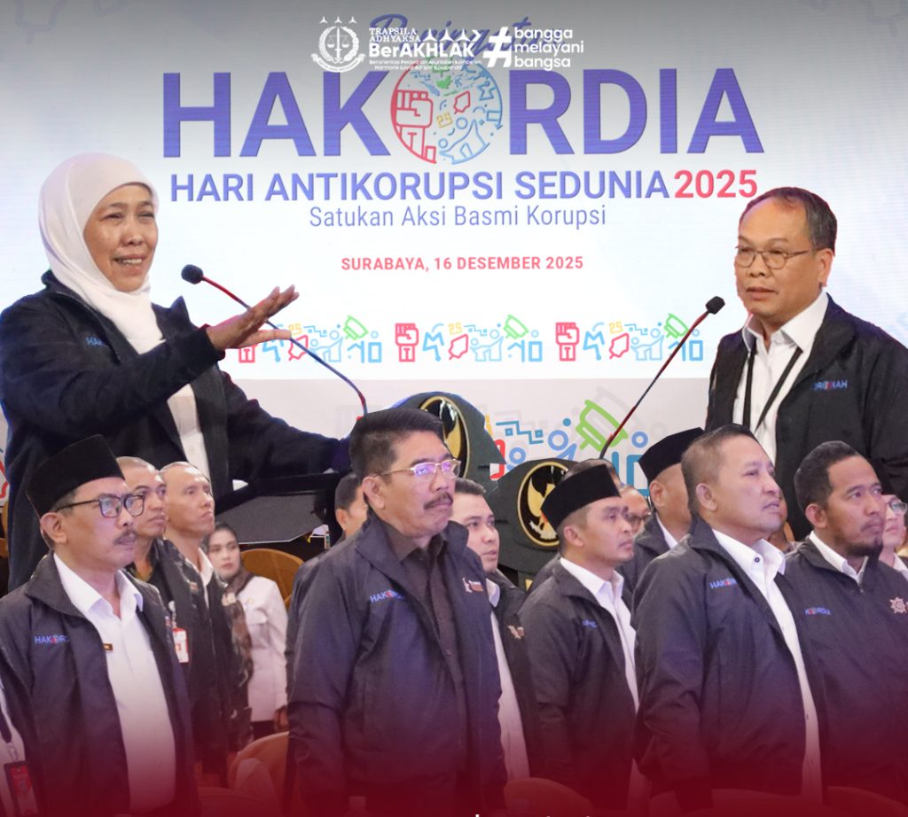 Surabaya – Kepala Kejaksaan Tinggi Jawa Timur yang diwakili oleh Wakajati Saiful Bahri Siregar, S.H., M.H., menghadiri acara puncak Peringatan Hari Antikorupsi Sedunia (Hakordia) Tahun 2025 yang diselenggarakan oleh Pemerintah Provinsi Jawa Timur di Grand Empire Palace Surabaya, Selasa (16/12/2025).