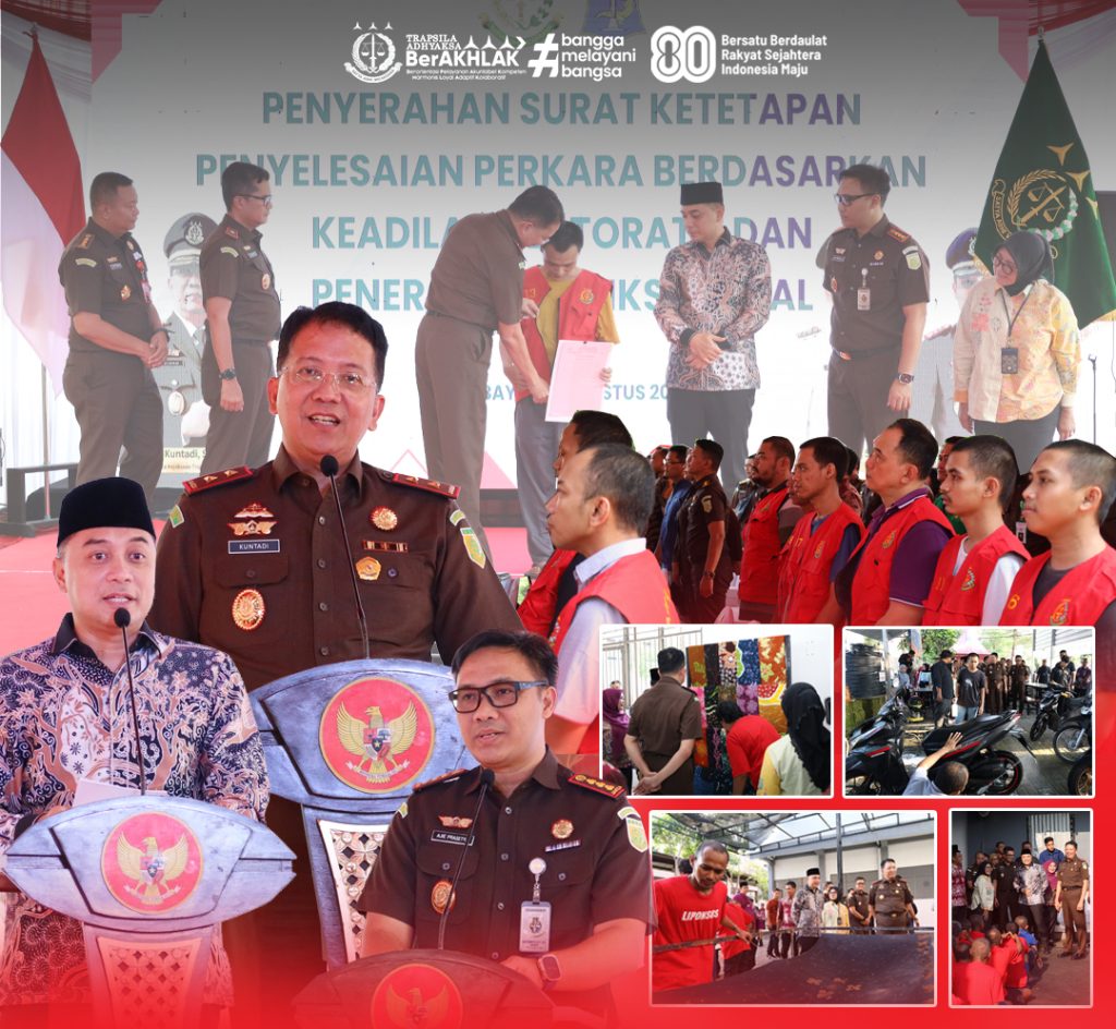 Surabaya – Kepala Kejaksaan Tinggi Jawa Timur, Dr. Kuntadi, S.H., M.H., menghadiri kegiatan Penyerahan Surat Ketetapan Penyelesaian Perkara Berdasarkan Keadilan Restoratif, Penerapan Sanksi Sosial, dan Penyerahan Bantuan Kewirausahaan bertempat di Lingkungan Pondok Sosial (Liponsos) Keputih Surabaya, Jumat (29/08/2025).