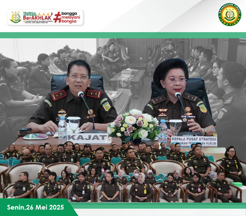 Kepala Kejaksaan Tinggi Jawa Timur, Dr. Kuntadi, menerima kunjungan kerja dari Kepala Pusat Strategi Kebijakan Penegakan Hukum (Kapustrajakgakkum) Kejaksaan RI, Dr. Tanti Adriani Manurung, beserta tim pada Senin, 26 Mei 2025, bertempat di Aula Kejaksaan Tinggi Jawa Timur, Surabaya.