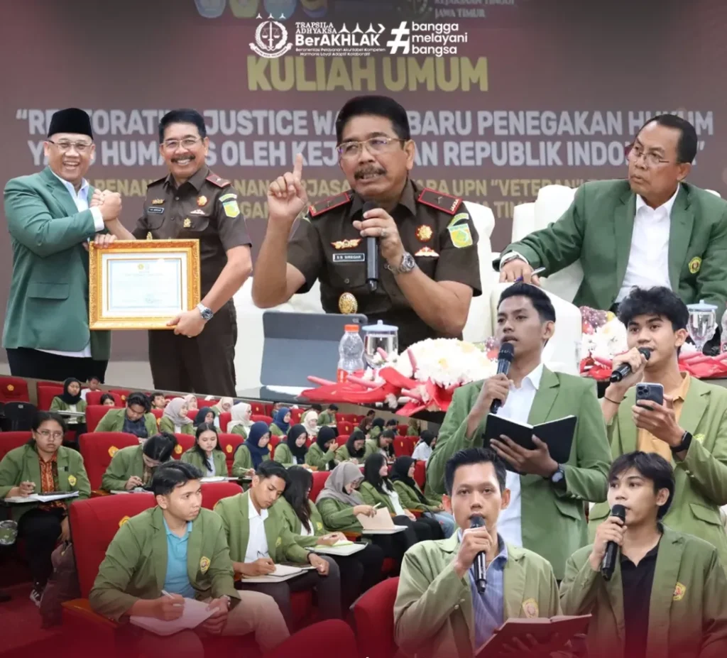 Surabaya – Kepala Kejaksaan Tinggi Jawa Timur yang diwakili oleh Wakajati Saiful Bahri Siregar, S.H., M.H., hadir sebagai pemateri dalam Kuliah Umum bertajuk “Restorative Justice: Wajah Baru Penegakan Hukum yang Humanis oleh Kejaksaan Republik Indonesia” yang diselenggarakan oleh Universitas Pembangunan Nasional (UPN) Veteran Jawa Timur, Selasa (23/12/2025).